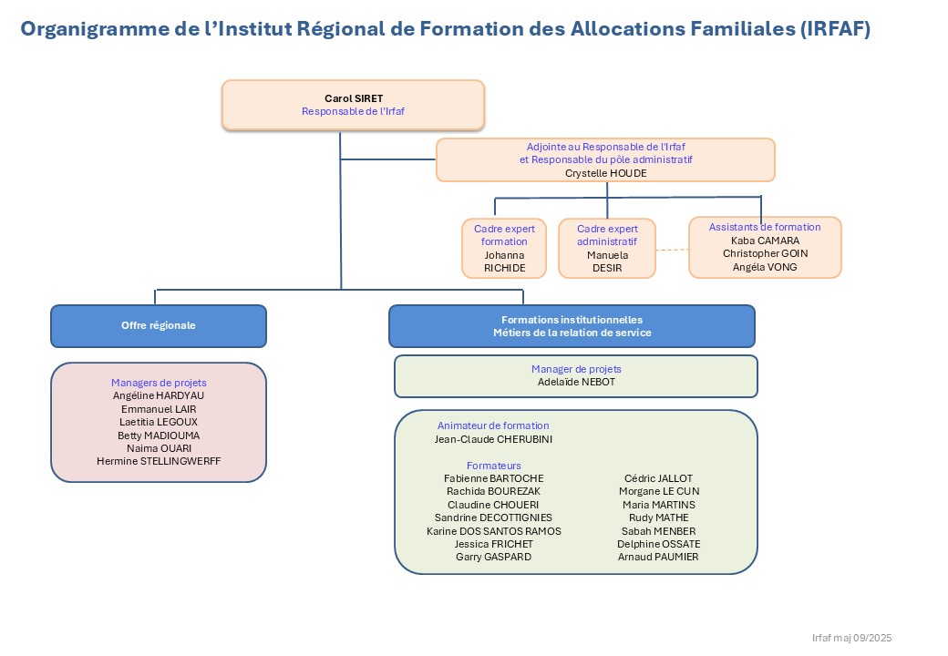 La Caisse nationale organise la mise en synergie des ressources d’appui autour de Caf pivots, en charge, au niveau de chacune des régions, de coordonner la gestion des formations initiales et des perfectionnements pour les métiers de la relation de service. Pour l’Île-de-France, ce rôle est confié à l’Irfaf.